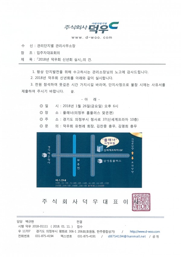 ■ 2018년 덕우회 신년회를 개최합니다. 페이지 정보 작성자 최고관리자 (115.♡.139.242) 작성일18-01-11 13:06 조회8,231회 댓글0건 관련링크 이전글 다음글 목록 본문 전원 참석하시어 뜻깊은 시간을 가졌으면 좋겠습니다.단지사정으로 불참시에는 사유서를 제출하여 주시기 바랍니다. 댓글목록 등록된 댓글이 없습니다. 이전글 다음글 목록